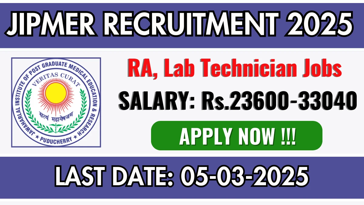 Jawaharlal Institute of Postgraduate Medical Education and Research (JIPMER) recruits 03 Research Assistant, Lab Technician Posts. Candidates with B.Sc, M.Sc, DMLT, MLT Can Apply on or before 05-03-2025.